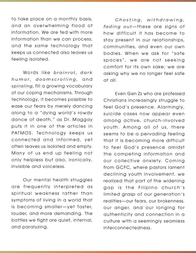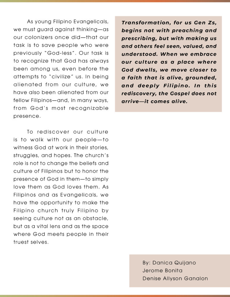 Three Gen Zslook at the Gospel in a Filipino context:Some reflections Posted on November 28, 2025 By admin No Comments on Three Gen Zslook at the Gospel in a Filipino context:Some reflections By: Danica Quijano, Jerome Bonita, Denise Allyson Ganalon Culture and Religion